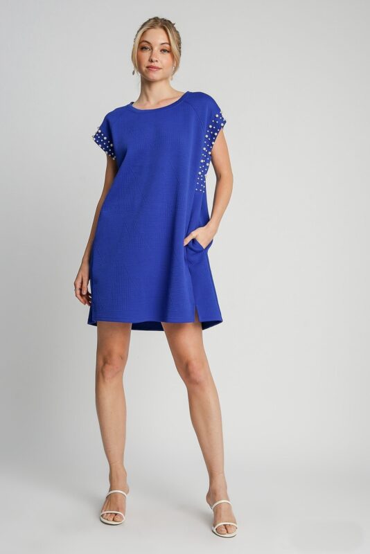 Umgee Textured Jacquard Dress with Pearl Details in Sapphire