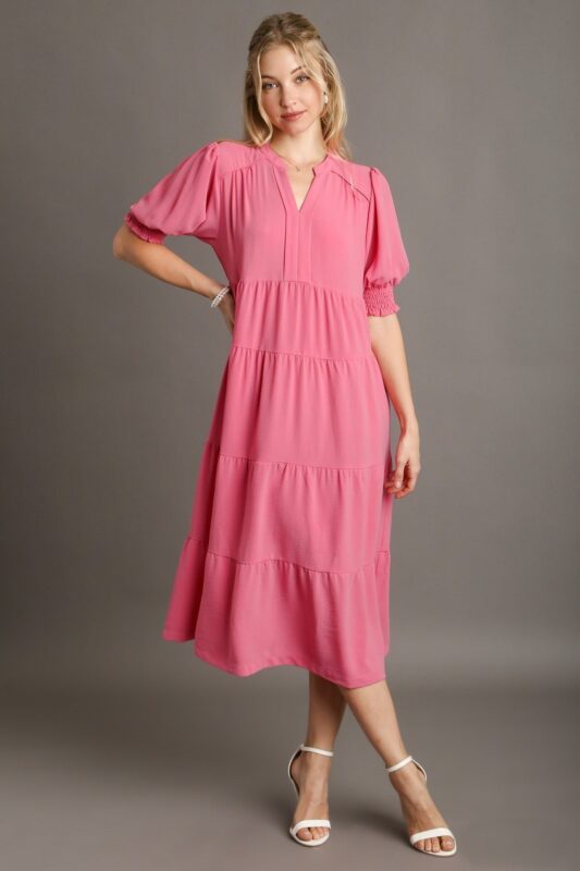 Umgee Split Neck A-Line Tiered Midi Dress in Coral Pink