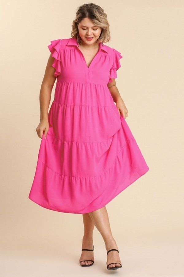 Umgee Tiered Midi Dress with Ruffled Sleeves in Hot Pink ON ORDER